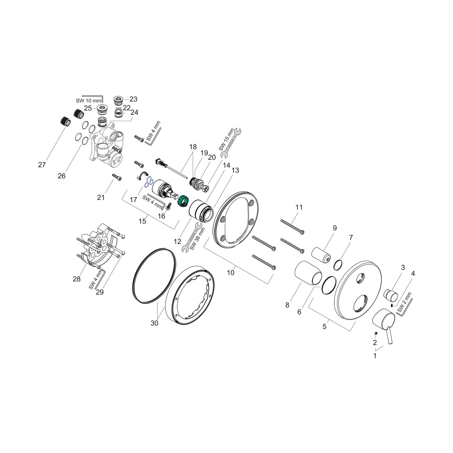 - Lieferumfang: Griff, Hülse, Rosette, Umsteller, Funktionsblock