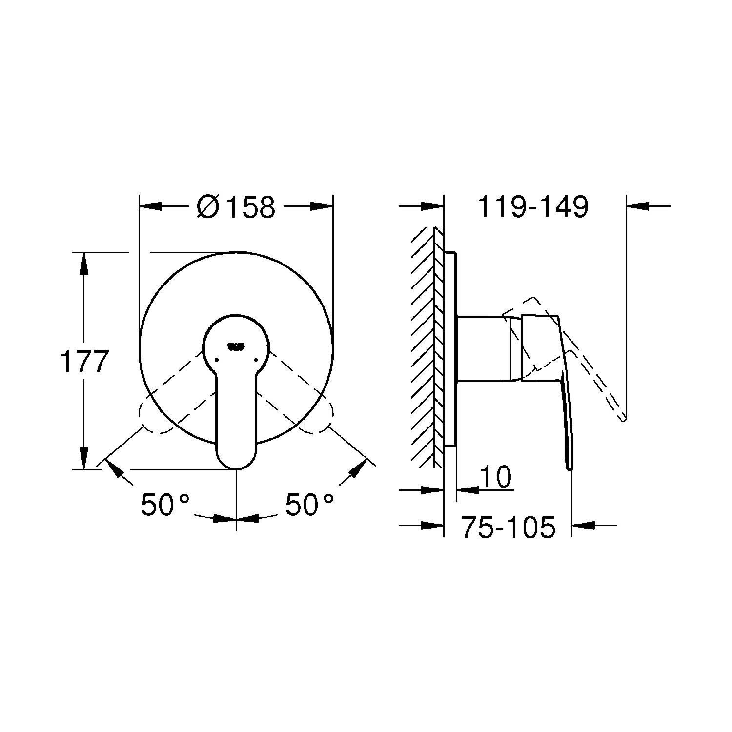 GROHE Eurostyle Cosmopolitan Einhand-Brausebatterie Fertigmontageset für Rapido SmartBox (35 600) GROHE SilkMove 46 mm Keramikkartusche GROHE StarLight Oberfläche Wandrosette mit GROHE QuickFix mit verdeckter Rosetten- und Schaftabdichtung, verdeckte Befestigung Rosette aus Metall, nachträglich 6 Grad ausrichtbar Bedienungshebel aus Metall Durchfluss: Abgang B oder C = 30 l/min ohne Rohbau-Set chrom