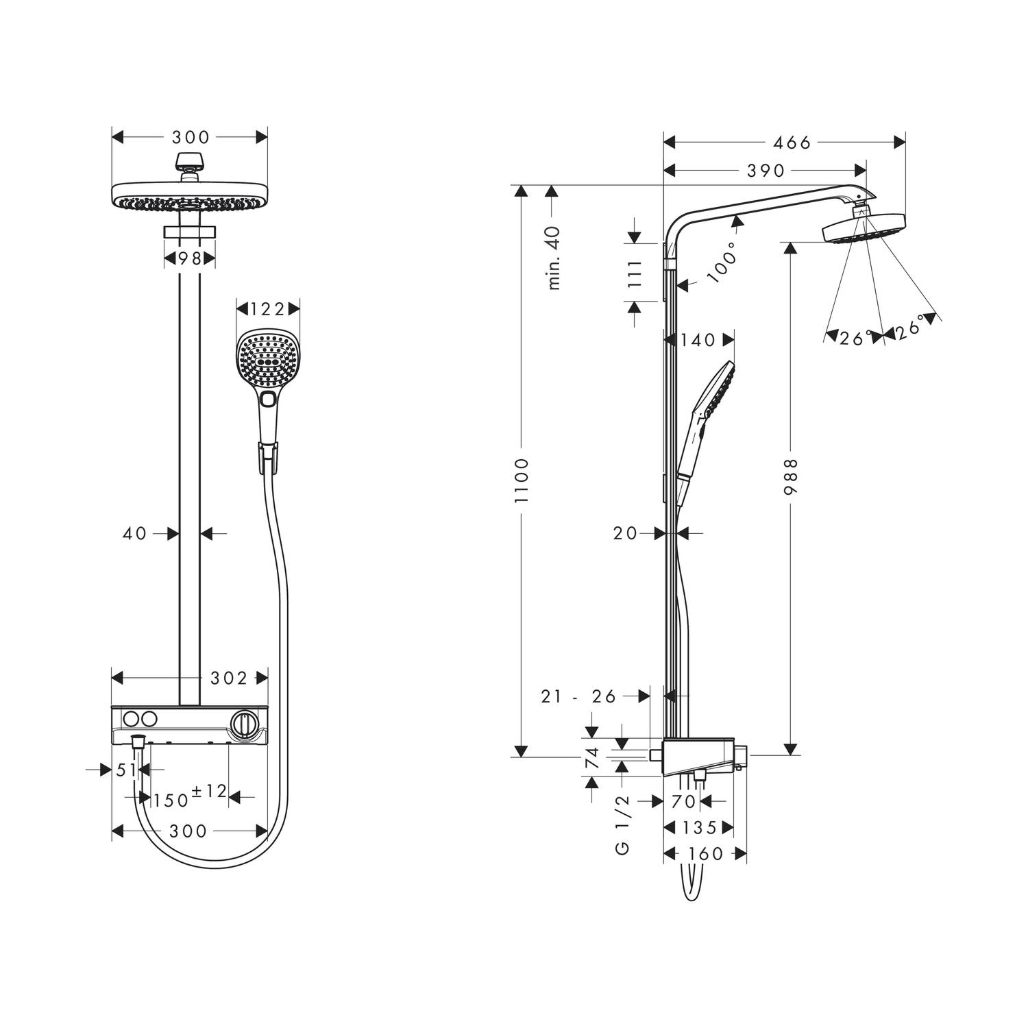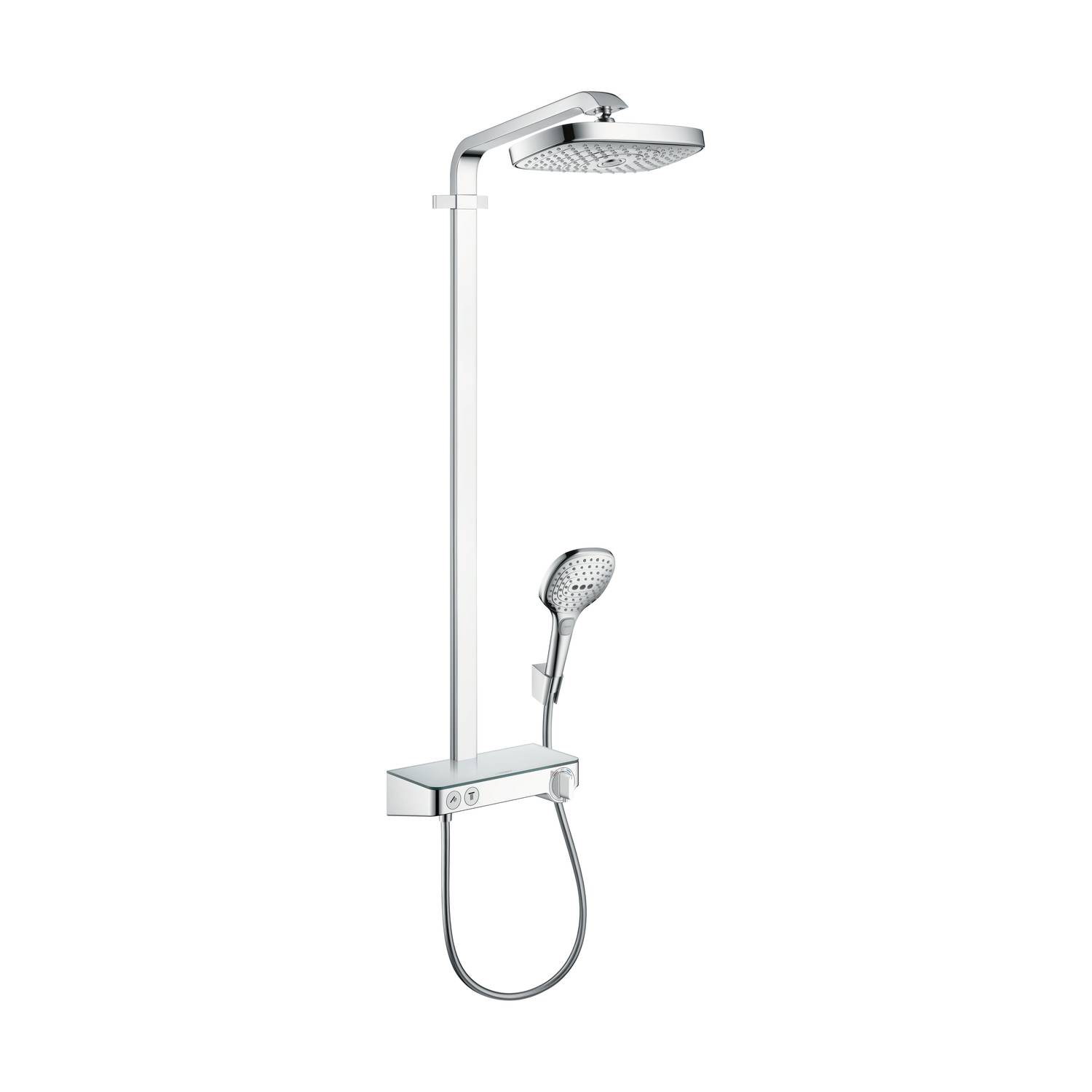 - Hochwertige Showerpipe in herausragender Form und mit nutzerfreundlichen Bedienfunktionen. Zur Showerpipe gehören Kopf- und Handbrause, das Hansgrohe Thermostat ShowerTablet Select 300, ein Brausehalter und Schlauch
