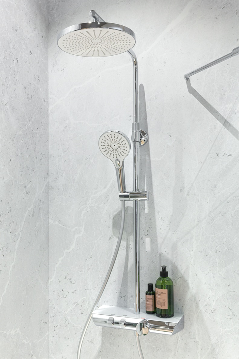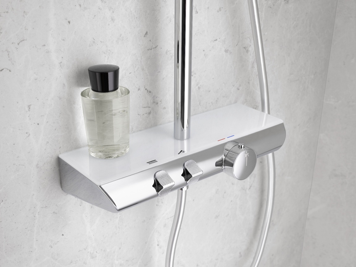 Mit Sicherheitsthermostat-Armatur, 38°C-Sperre und Echtglasablage (ESG)