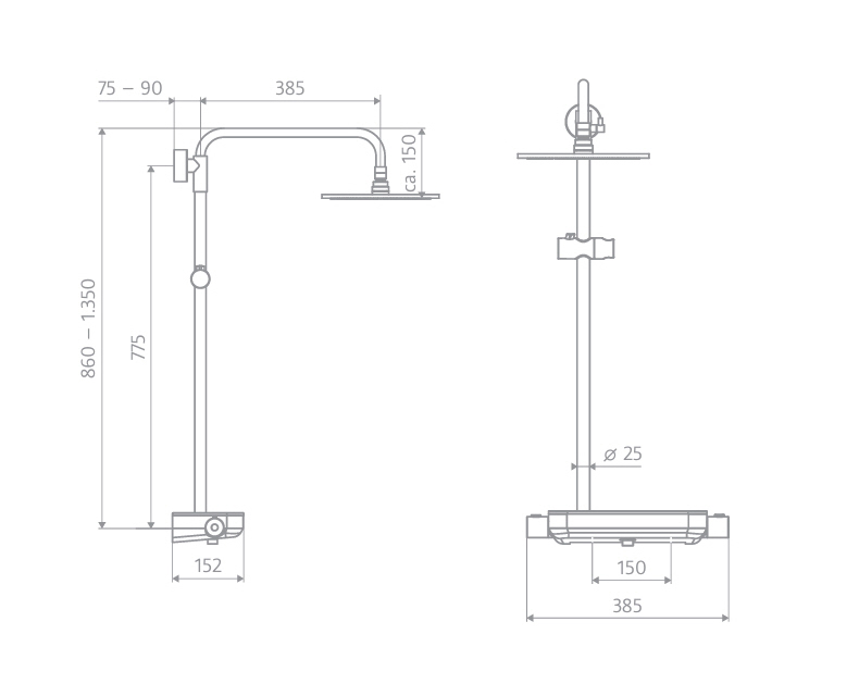 - Tiefe: 385 mm + Halterung und Kopfbrause