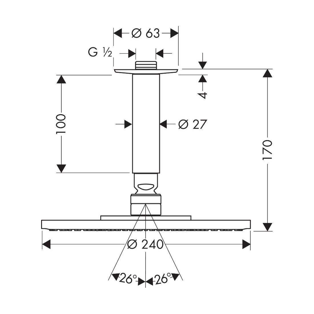 - Deckeninstallation mit Anschlusslänge 100 mm – ideal auch für kleinere Duschbereiche