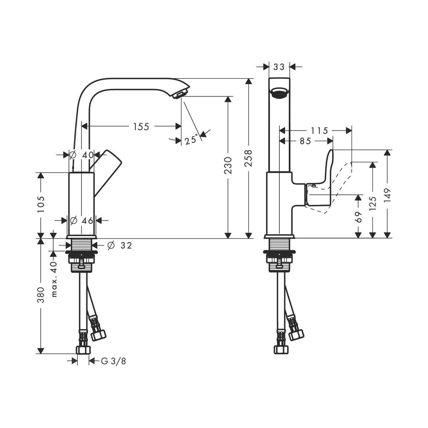 - Anschlussart: G 3/8 Zoll Anschlussschläuche