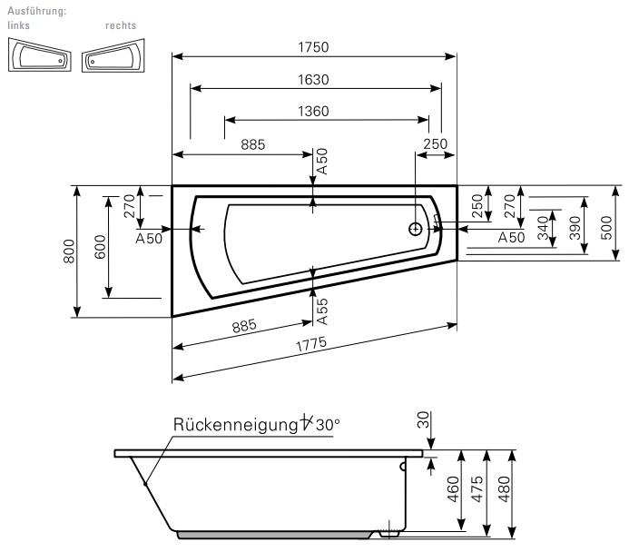 Die Wanne Ascea ist jeweils als linke und rechte Ausführung möglich.