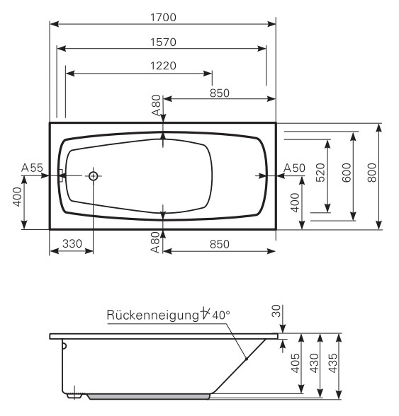 | Tiefe: Wasserfüllmenge: Innere Bodenlänge: Ablauf: | 435 mm 100 Liter 1130 mm 52 mm | 405 mm 125 Liter 1220 mm 52 mm | 405 mm 125 Liter 1220 mm 52 mm |