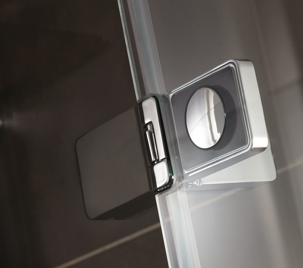 Die innen glasbündigen Dreh- und Pendeltür-Scharniere bilden mit dem Echtglas (ESG) eine perfekte Einheit. Die Reinigung der Glasflächen wird damit ein Kinderspiel.