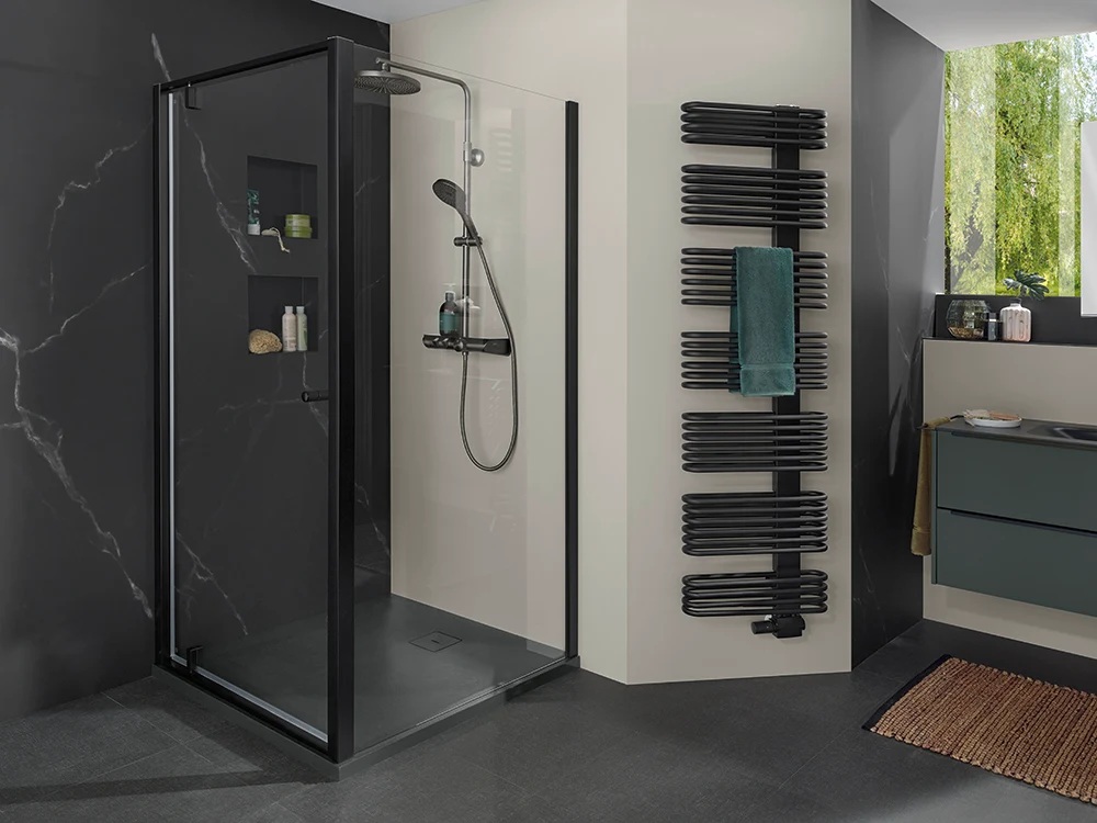 Das neuartige System besteht aus 3 mm starke Aluminium-Verbundplatten, welche mit schlanken Aluminium-Profilen - in den Farben Alu silber-matt, Schwarz-matt oder Chrom-Optik - verbunden werden. Fugen gibt es keine! Die glasähnlichen Optik des Plattenmaterials besitzt neben der edlen Tiefenwirkung auch eine hochwertige Oberfläche mit schmutzabweisender Wirkung. Das erhält jeden Duschbereich dauerhaft brillant und schön!