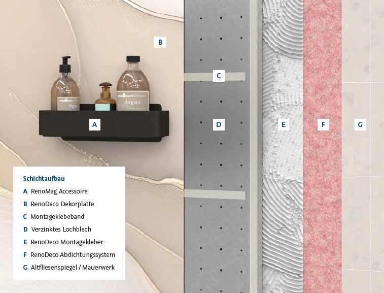 RenoMag Accessoires sind nur in Verbindung mit dem Lochblech-Set oder ähnliche metallische Untergründe, RenoDeco Dekorplatten und RenoDeco Abdichtungssystem zu verwenden. Wurde die RenoDeco Wandverkleidung ohne das Lochblech-Set montiert, ist eine nachträgliche Integration der RenoMag Accessoires nicht möglich.