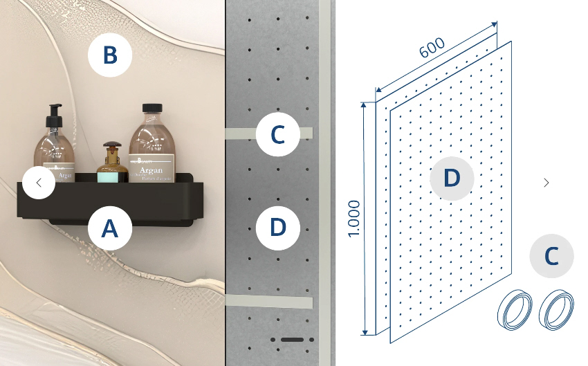 RenoMag Accessoires sind nur in Verbindung mit dem Lochblech-Set oder ähnliche metallische Untergründe, RenoDeco Dekorplatten und RenoDeco Abdichtungssystem zu verwenden. Wurde die RenoDeco Wandverkleidung ohne das Lochblech-Set montiert, ist eine nachträgliche Integration der RenoMag Accessoires nicht möglich.