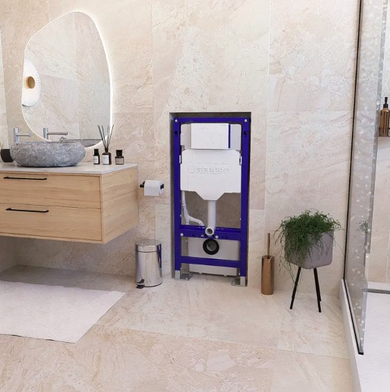 Der Saniwall Pro UP Evo wird unsichtbar hinter dem wandhängenden WC montiert und integriert sich vollständig in die Vorwand. Das stabile Geberit Duofix Trägersystem ermöglicht eine schnelle, saubere Montage und bietet maximale Flexibilität bei der Wandgestaltung, da die Oberfläche frei verfliest werden kann.