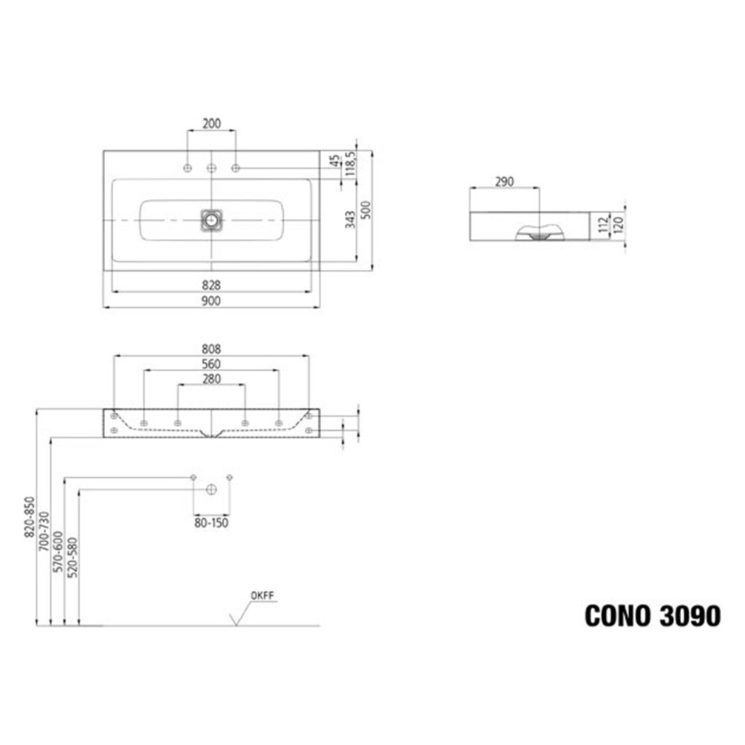 - Alle Cono Waschtische mit Breite 1200 mm jetzt auch mit 1x1er oder 1x3er Hahnlochbohrung erhältlich.