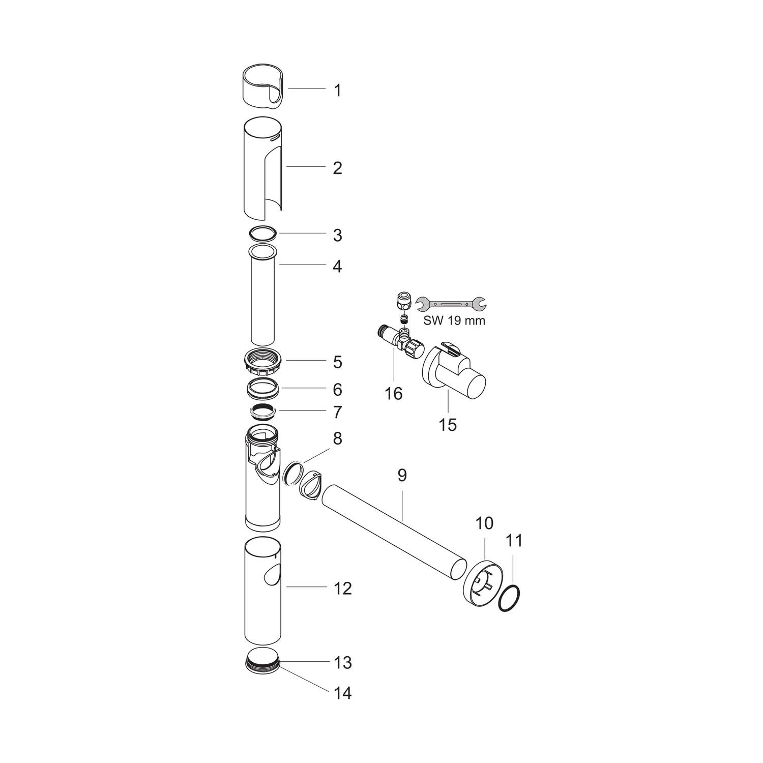 - Lieferumfang: Tauchrohr 140 mm, Wandrohr, Rosette Ø 70 mm, Ventilblende, 2 Eckventilschuber mit Eckventil