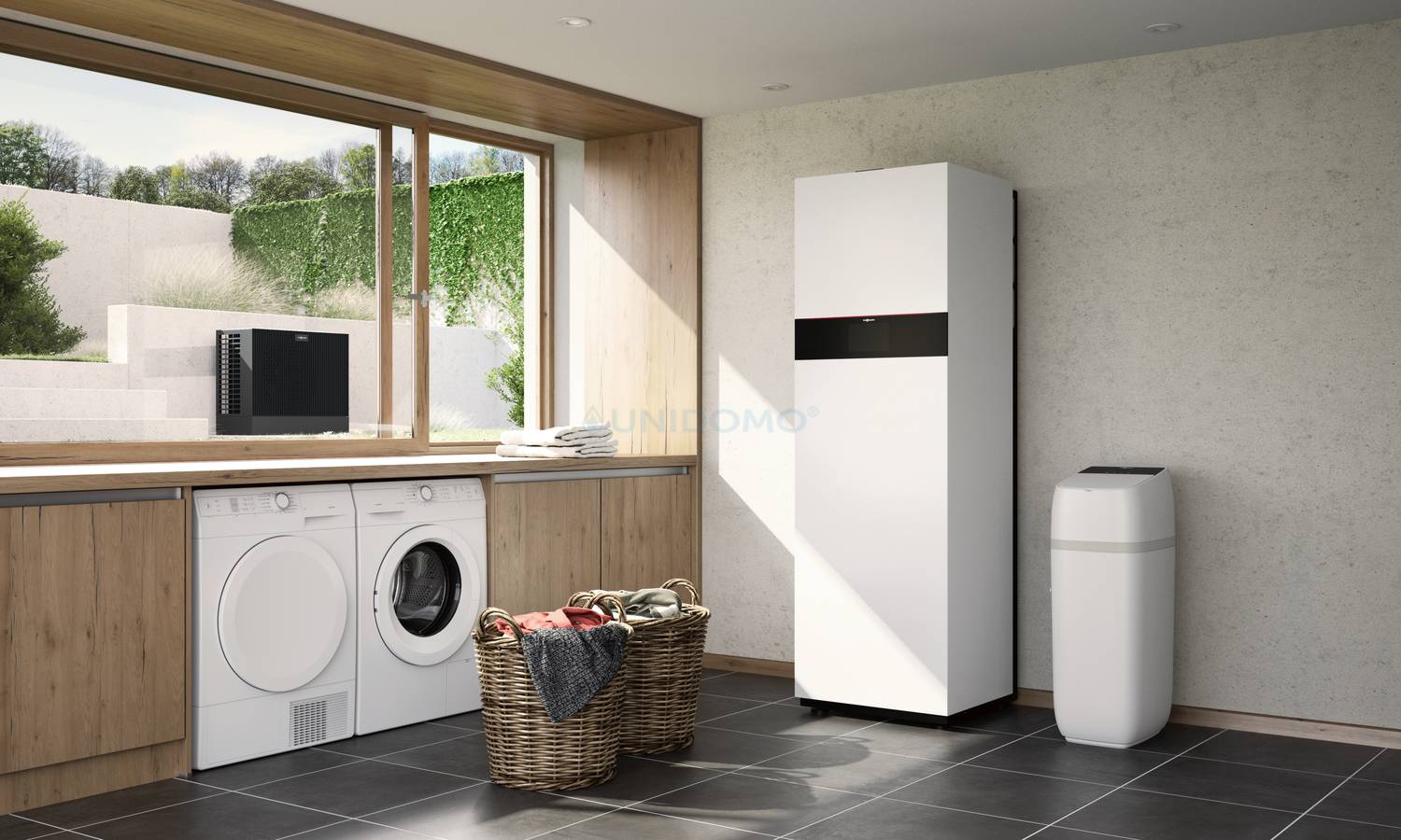 - Kompakte Bauweise: Durch ihre geringe Aufstellfläche ist die Vitoset Aqua ideal für jede Hausgröße. Sie passt sogar unter wandhängende Wärmeerzeuger wie die Vitocal 200-S Luft/Wasser-Wärmepumpe.