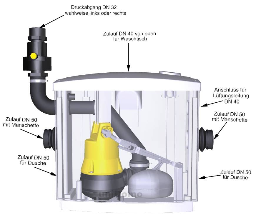 Durch diese Anschlussmöglichkeiten kann die Hebeanlage flexibel an verschiedene Entwässerungsstellen angeschlossen werden.