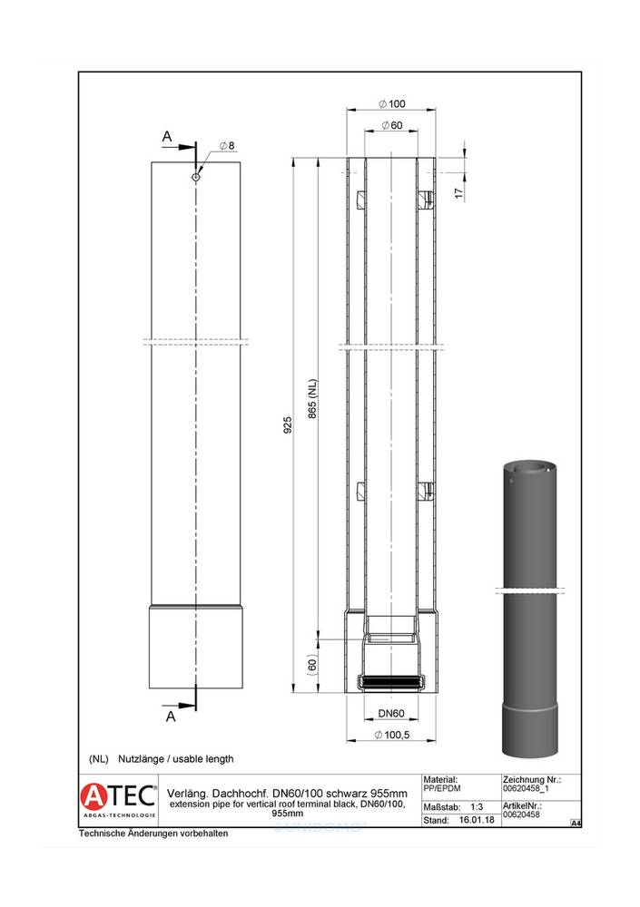 ATEC Abgas Verlängerung zur Dachhochführung DN 60/100 schwarz 955mm