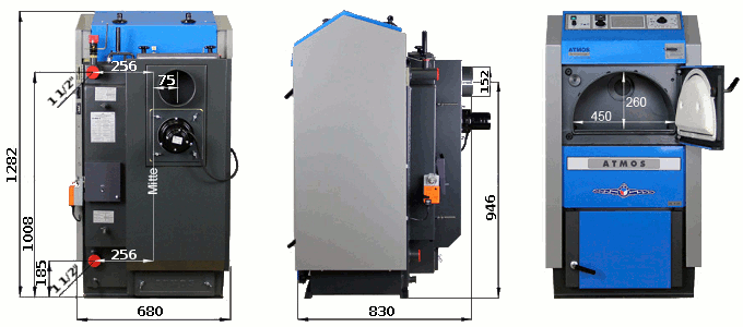 | Nennleistung: Wirkungsgrad: Kesselgewicht: Staub Emission: CO Emission: Höhe: Breite: Tiefe: max. Brennholzlänge: Füllöffnung Abmessung: | 19 kW 90,2 % 376 kg 12 mg/m³ 152 mg/m³ 1282 mm 830 mm 680 mm 380 mm 450 x 260 mm |