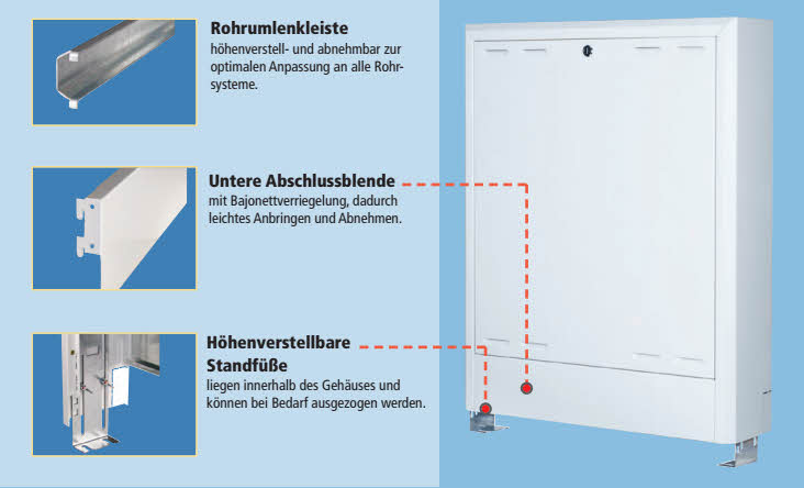 Ein Heizkreisverteiler ist das Kernstück einer jeden Fußbodenheizung. Mit dem Buderus Aufputz Verteilerschrank erhalten Sie eine optimale Kombination aus einfacher Montage, stufenloser Rohrleitungszuführung sowie großzügigem Platzangebot für elektrische Regelungskomponenten. Dank der verstellbaren Höhe und Tiefe passt sich der Verteilerschrank flexibel an unterschiedliche Einbausituationen an.