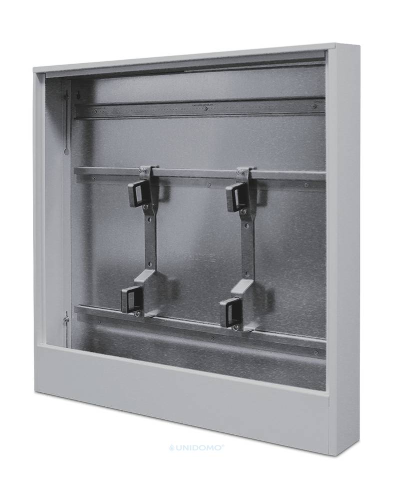 Der Korpus kann mit Hilfe der Langlöcher problemlos von der Rückwand abgehoben werden. Nach der Verlegung des Oberbodenbelags kann der Schrankkorpus wieder auf die an der Rückwand befindlichen M8 Gewinde gesteckt und mit den Muttern abschließend befestigt werden. Der Verteilerkasten ist in den Potentialausgleich einzubringen.
