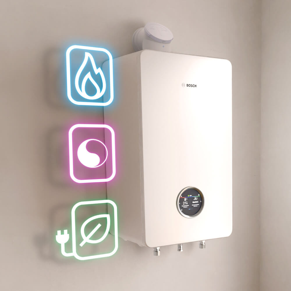 Mit der Bosch Compress Hybrid 5800i G bleiben Sie handlungsfähig. Heute und in der Zukunft. Sie starten sofort sicher mit Gas, ergänzen bei Bedarf eine Luft-Wasser-Wärmepumpe zum Hybridsystem* oder steigen per Zubehör auf 100 % elektrisches Heizen um. Alles in einem Gerät, ohne großen Umbau und mit durchgängiger Bedienung über das UI 800 Touch.