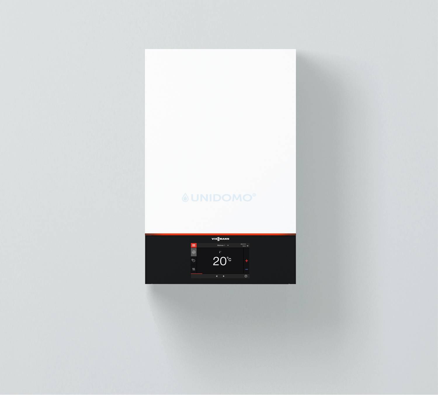 Der Vitodens 300-W ist zudem CAN- und WLAN-fähig und kann mit anderen Viessmann Systemkomponenten über die One Base Plattform kommunizieren – z. B. als Hybridlösung mit einer Vitocal Wärmepumpe oder in Kombination mit Solarthermie.