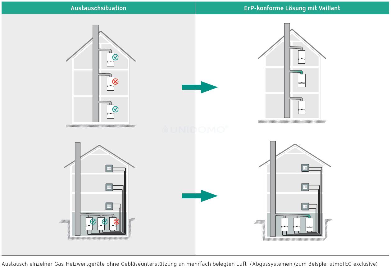 Die Ökodesignrichtlinie ErP erlaubt den Austausch einzelner Gas-Heizwertgeräte ohne Gebläseunterstützung am mehrfach belegten Kamin.