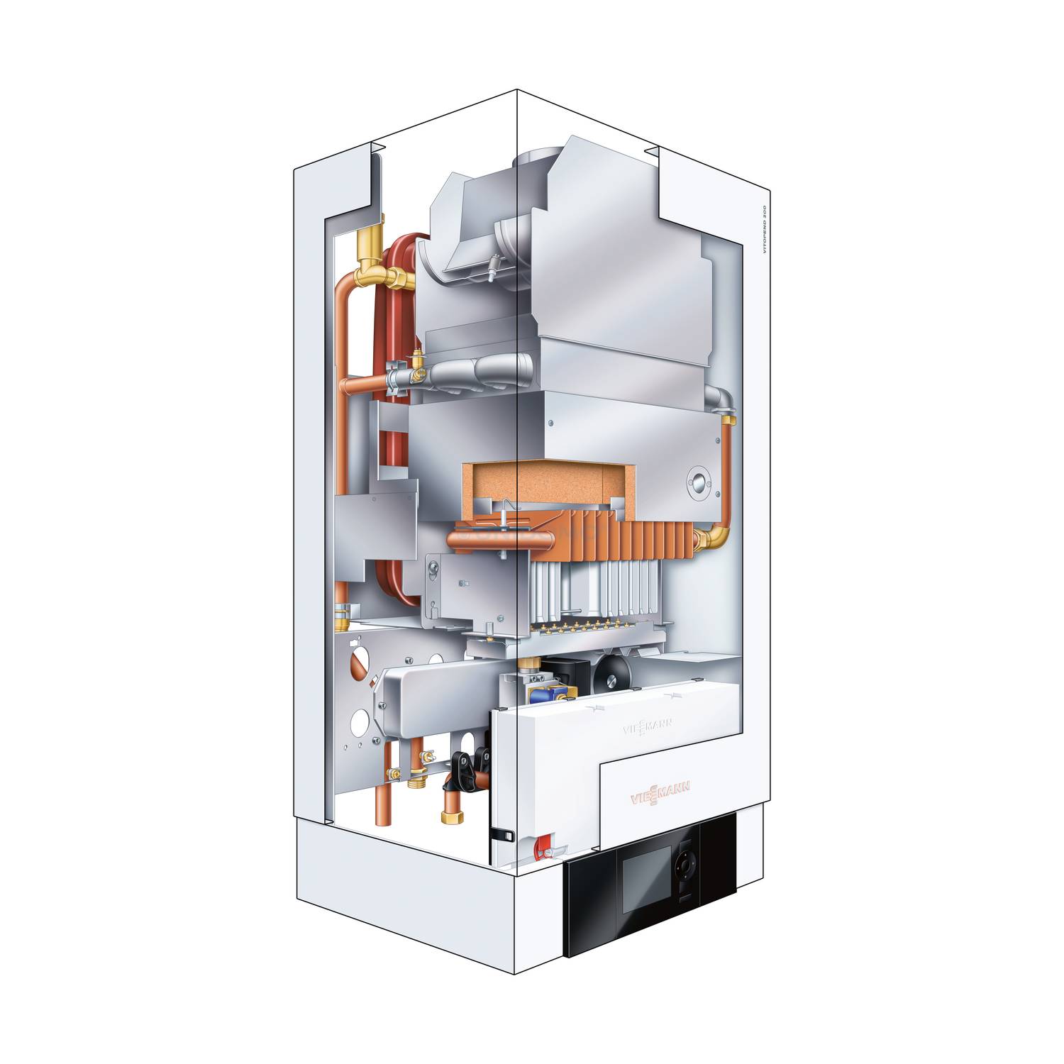 Mit modulierendem, atmosphärischem Vormischbrenner mit Wasserkühlung. Für Erdgas E/LL nach EN 297 geprüft und zugelassen, mit Brennersteuergerät mit integrierter Abgasüberwachungseinrichtung, Gaskombiregler mit 2 Gasventilen, Ionisations-Flammenüberwachung und elektrischer Hochspannungszündung. Mit eingebauter drehzahlgeregelter Hocheffizienz-Heizkreispumpe, eingebautem Ausdehnungsgefäß und Sicherheitsarmaturen. Mit integriertem Durchlauferhitzer (Plattenwärmetauscher)