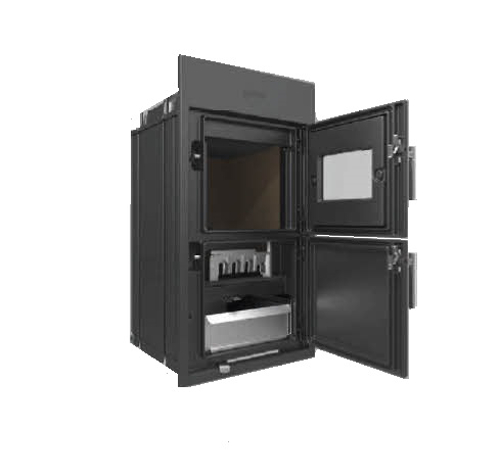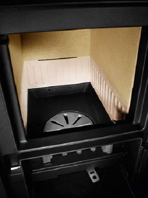 - Heizeinsatz aus hochwertigem Gusseisen, inkl. Ausmauerung, Rüttelrost und Frontplatte 790 x 396 mm