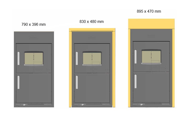 - Durch Anbauleistensets lassen sich die Frontplattenmasse auf 830 x 480 mm bzw. 895 x 470 mm vergrößern