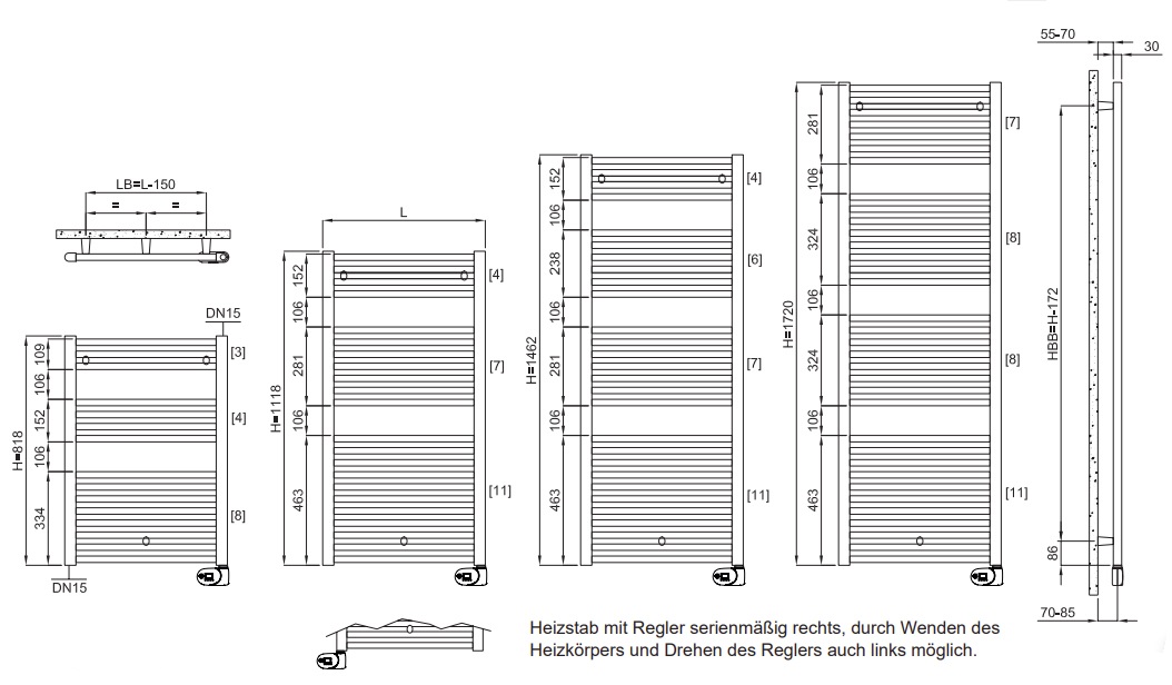 - durch Wenden des Heizkörpers und Drehen des Reglers kann der Heizkörper auch mit Heizstab links montiert werden
