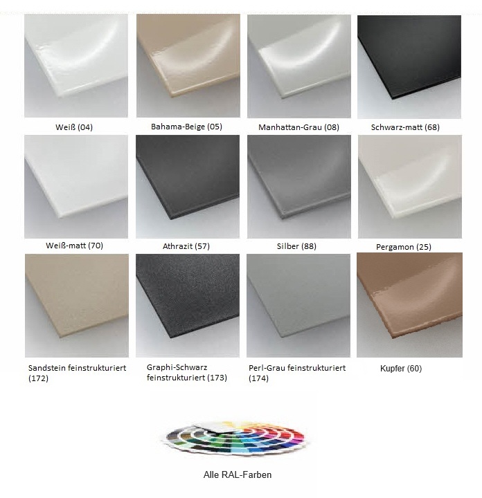 - Glänzend: Pergamon, Bahama-Beige, Kupfer, Manhattan-Grau, Silber, Anthrazit