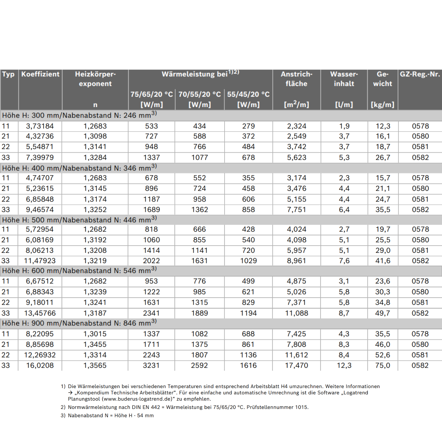 1) Nach DIN EN 442 2) Normwärmeleistung nach DIN EN 442 = Wärmeleistung bei 75/65/20 °C 3) Nabenabstand N = Höhe H - 54 mm | |||