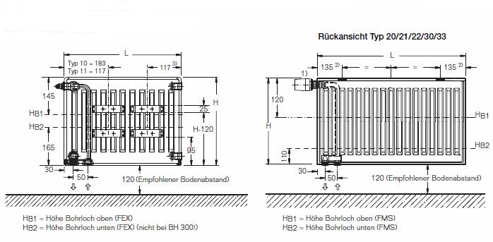 - Typ 21 und 22 auf links drehbar, Standard Rohranschluss unten rechts