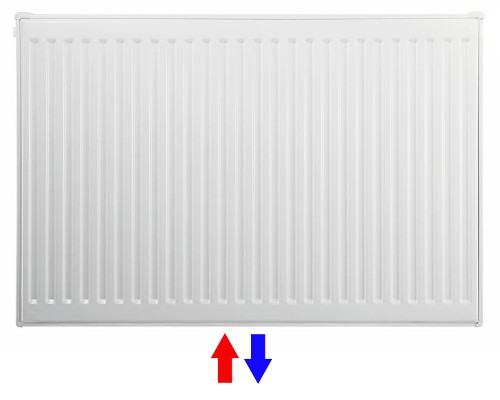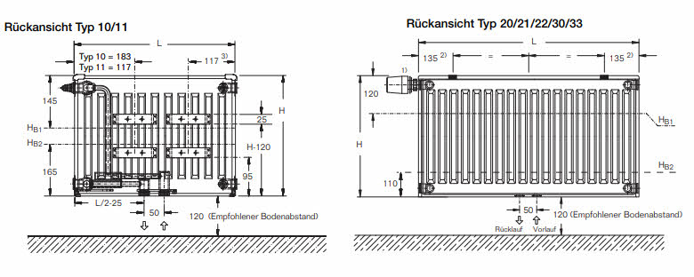 - Rohranschluss unten rechts (Typ 21 und 22 auf links drehbar)