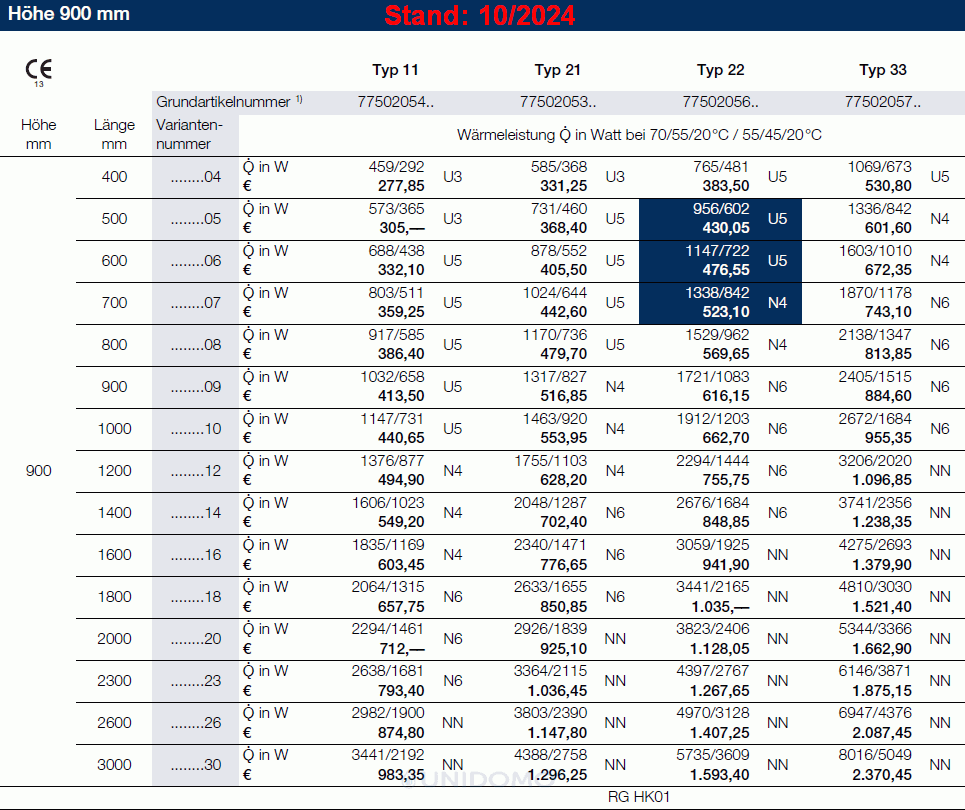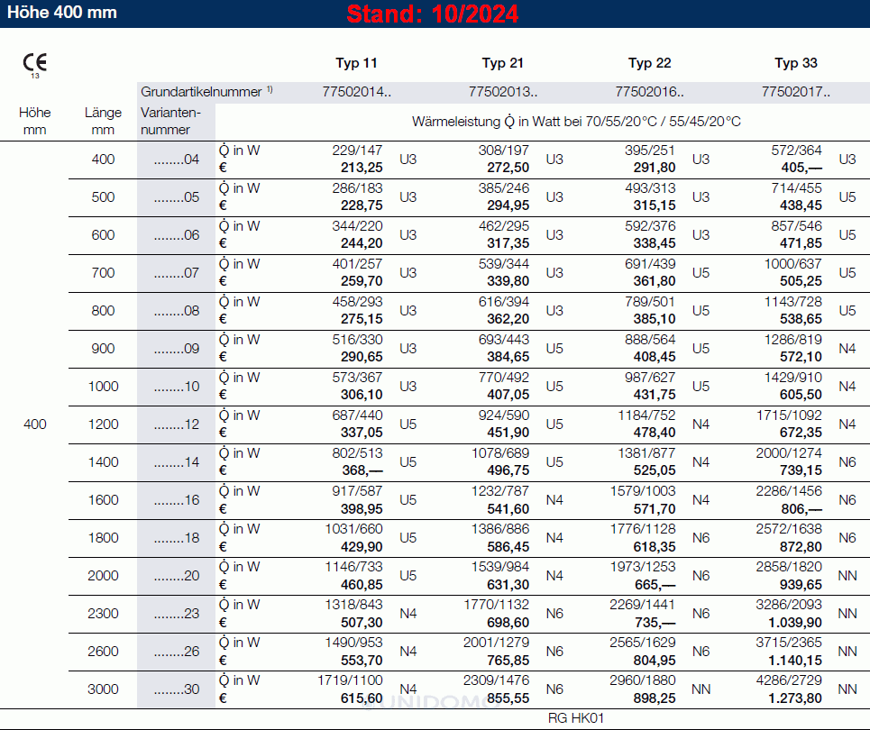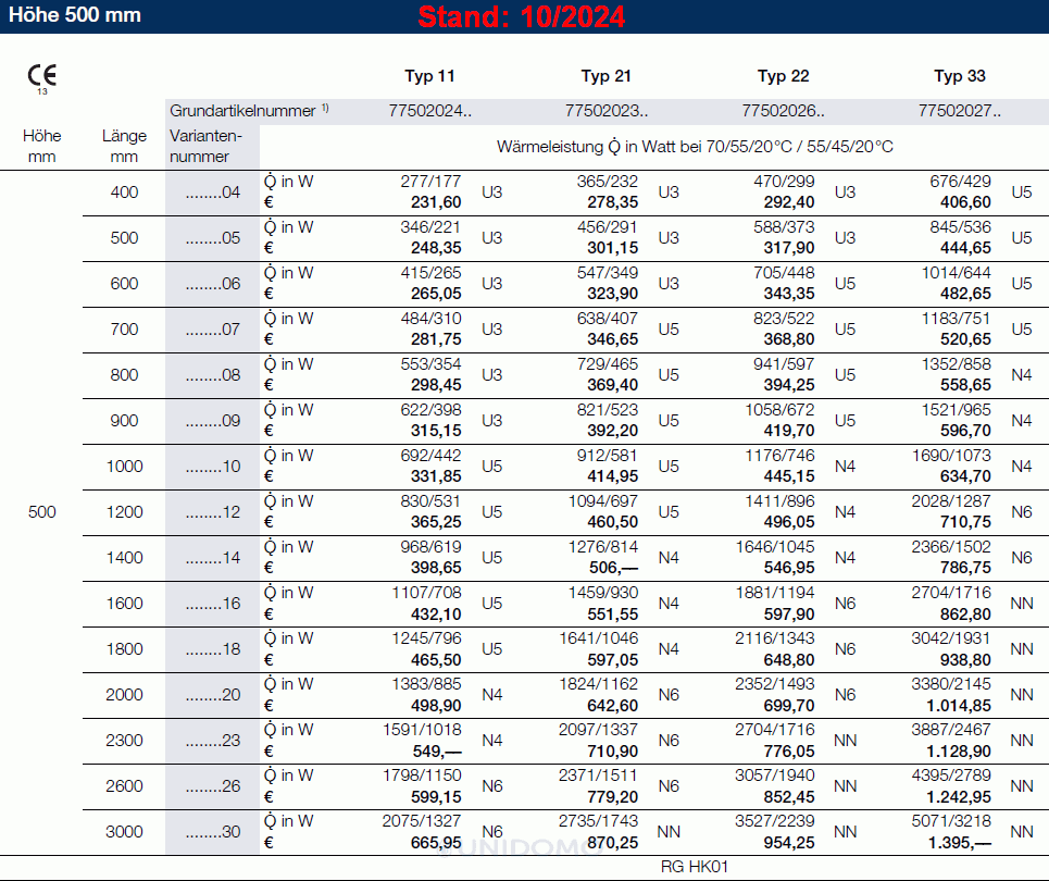 Buderus VCM-Profil Mittelanschluss Ventilheizkörper Typ 11 21 22 & 33 Höhe: 300 – 900 mm Länge 400-3000 mm 2024