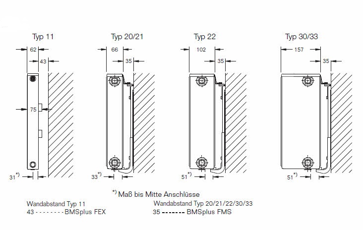 - Rohranschluss unten links (ohne Aufpreis, Typ 11 und 33), bitte anrufen oder per Mail vermerken