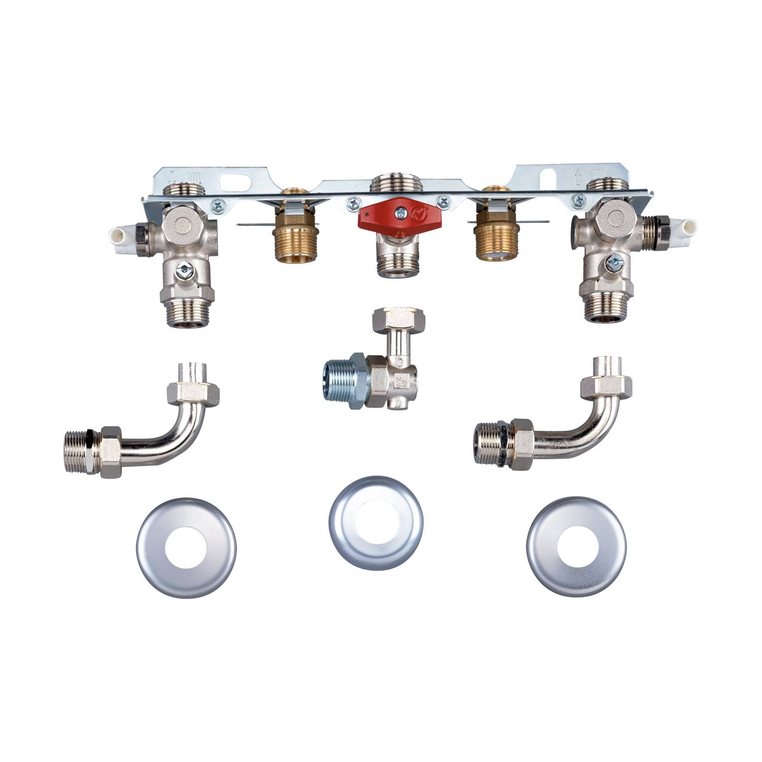Montageanschlussplatte für Speicheranschluss komplett für Erd- und Flüssiggas inkl. Wartungshähne R 3/4 Zoll, mit Entleerventilen, Gashahn inkl. TAE R 1/2 Zoll, Rückflussverhinderer.