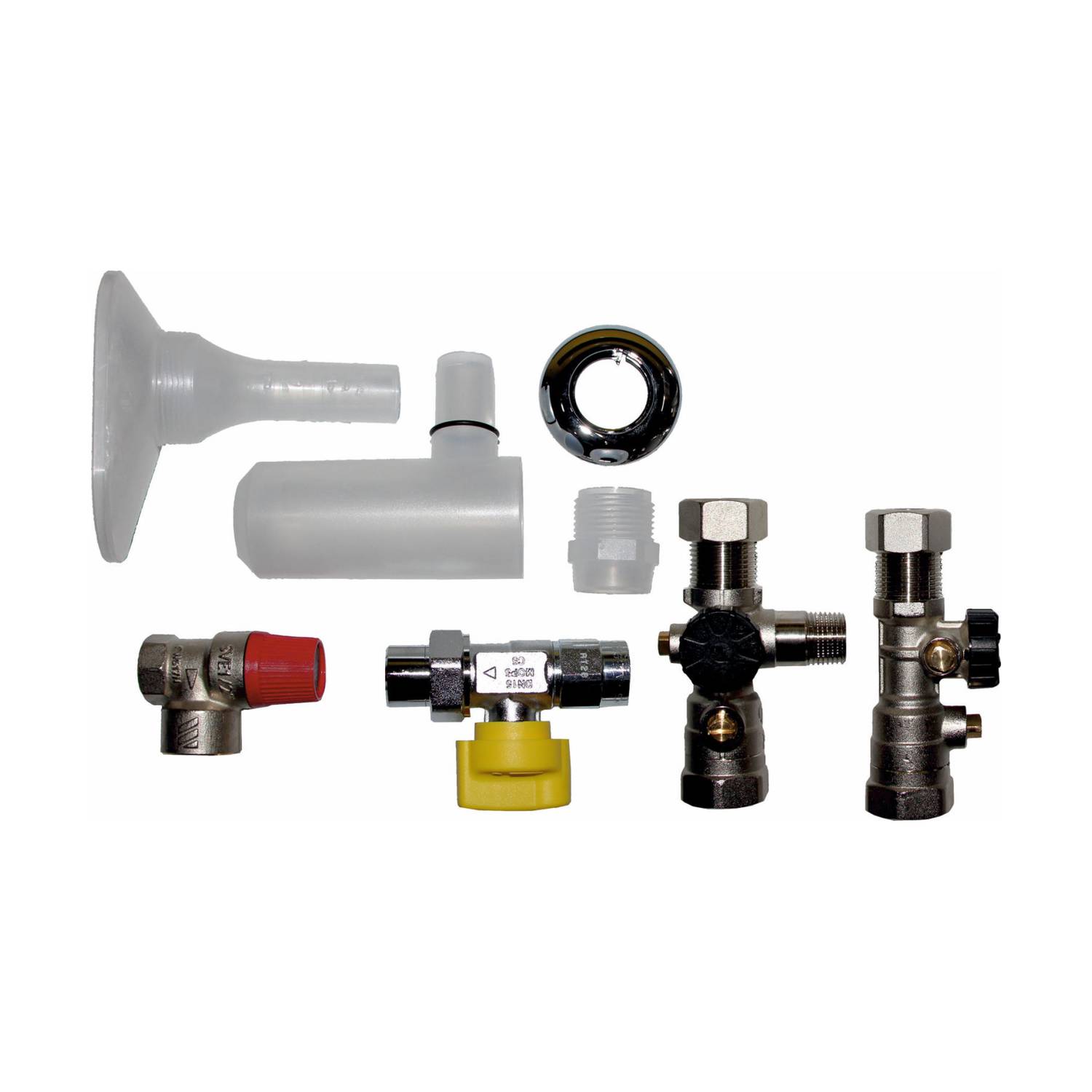 Gaskugelhahn mit thermischer Sicherung, Durchgangswartungshahn mit KFE-Hahn, Durchgangswartungshahn mit KFE-Hahn und Anschluss für Sicherheitsventil R 1/2, Sicherheitsventil 3bar Ansprechdruck, Ablauftrichter