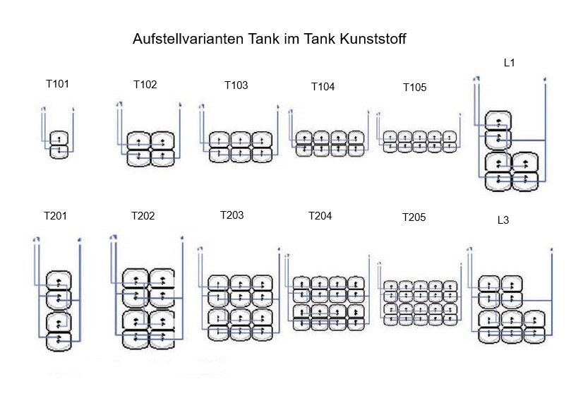 Tank mit integrierter Auffangvorrichtung; Tank aus hochmolekularem Polyethylen, Sekundärbehälter und Palette aus verzinktem Stahlblech. Doppelwandiges Tanksystem zur Batterie-, Block-, Winkel- und L-Aufstellung für die variable Heizöllagerung.