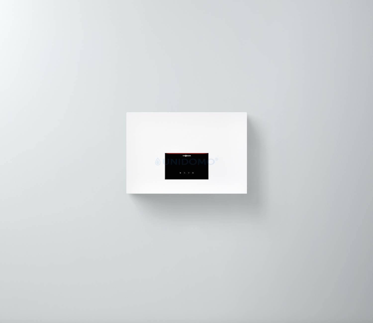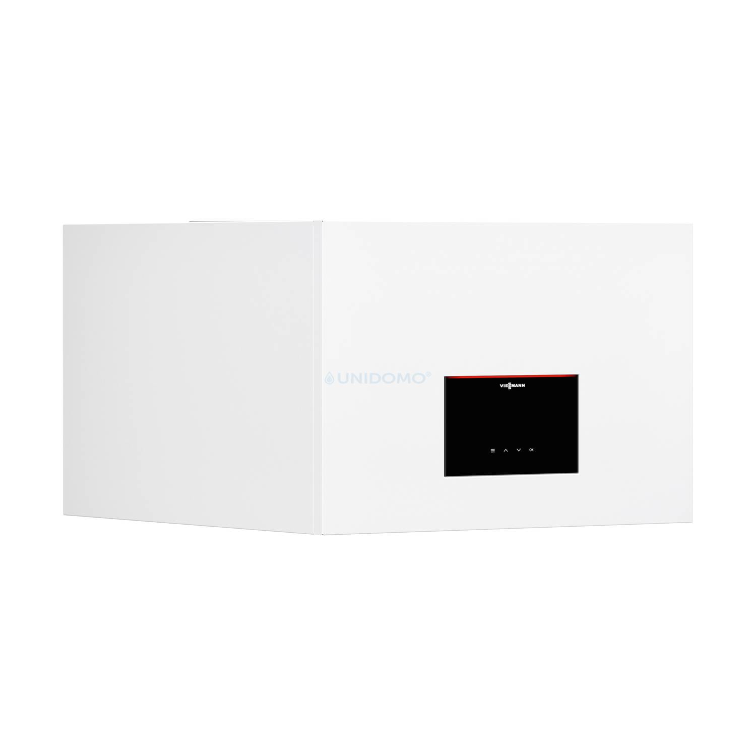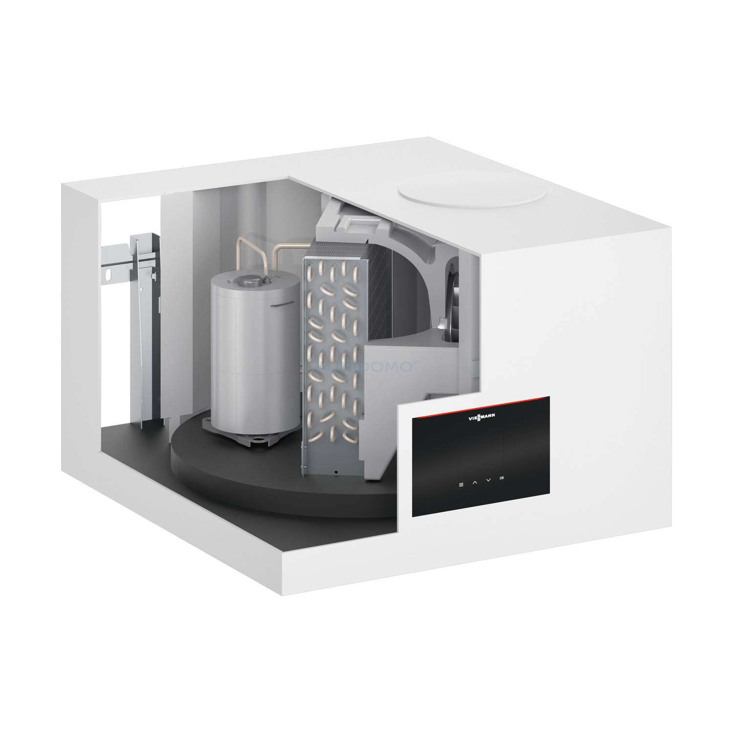 - Bestehend aus Luft-Wasser-Wärmepumpen Modul, Speicher-Wassererwärmer und integrierter Regelung mit Touch-Display (Vitodens 100 Typ).