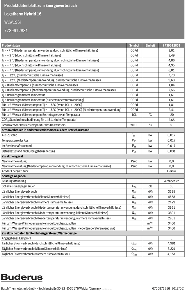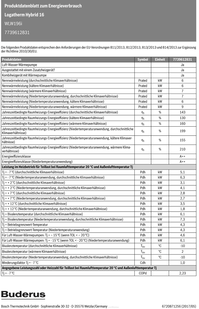 Jahreszeitbedingte Raumheizungs-Energieeffizienz der Verbundanlage bei durchschnittlichen Klimaverhältnissen (WP) 145 %