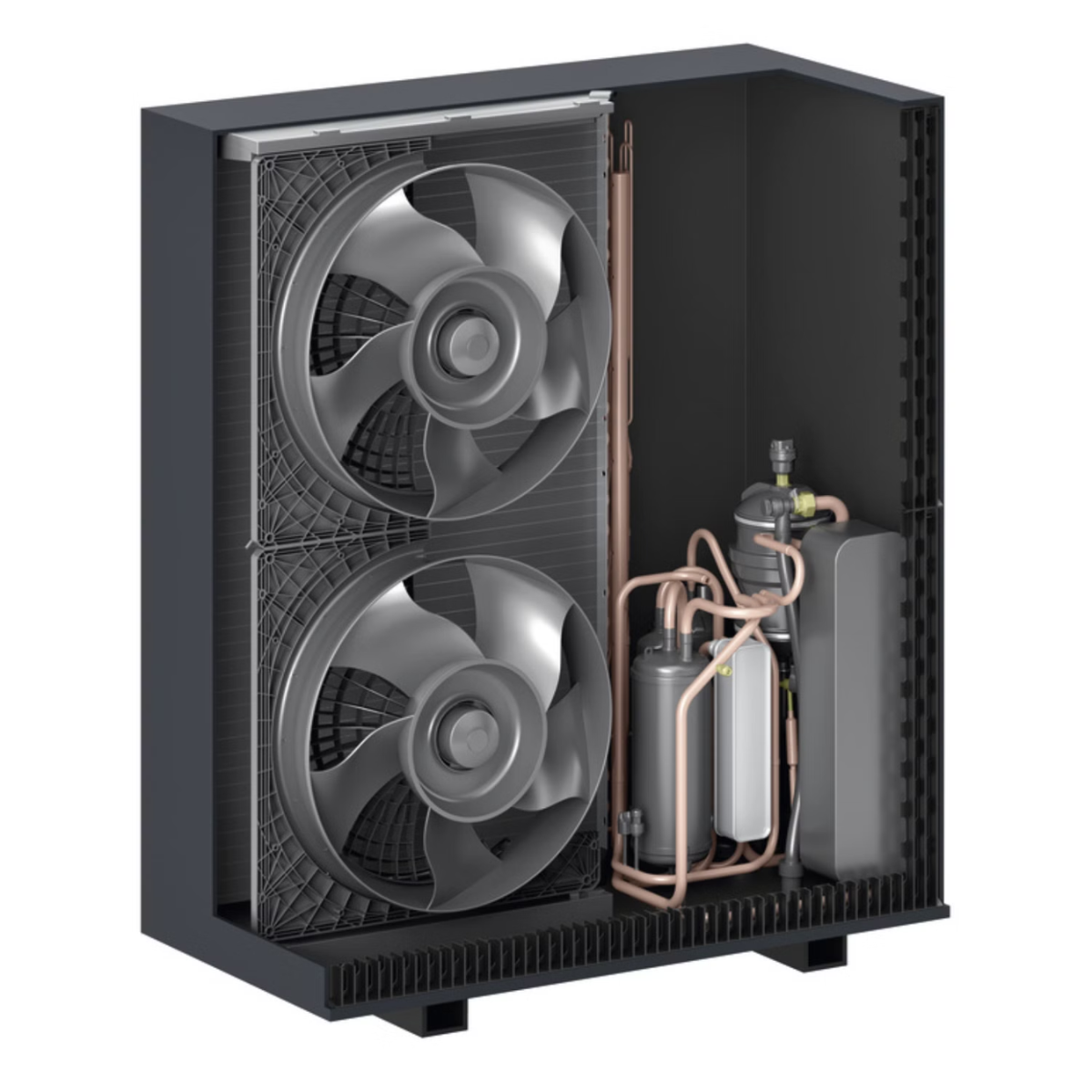 Die Vitocal 250-A Compact besteht aus einer Außeneinheit (ODU 250-A) und einer bodenstehenden Inneneinheit IDU-A Compact mit integriertem 190-l-Speicher-Wassererwärmer. Die Verbindung zwischen Außen- und Inneneinheit erfolgt über Quattro-Verbindungsleitungen (Zubehör). Die Außeneinheit wird auf einer Boden- oder Wandkonsole montiert, die Inneneinheit ist als Kompaktgerät bodenstehend ausgeführt.
