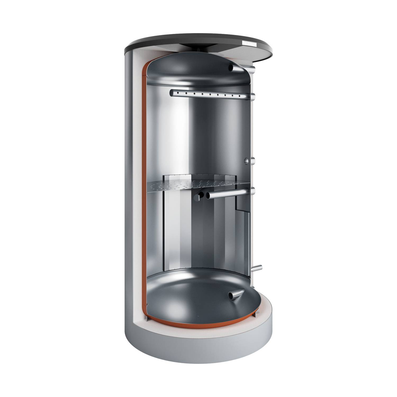 - Pufferspeicher für Wärmepumpen mit effizienter, temperatursensibler Schichtladeeinheit mit 2 Rücklaufanschlüssen, Diffusorstab zur beruhigten Beladung und 2 Trennblechen zur Vermeidung der Durchmischung der Temperaturzonen