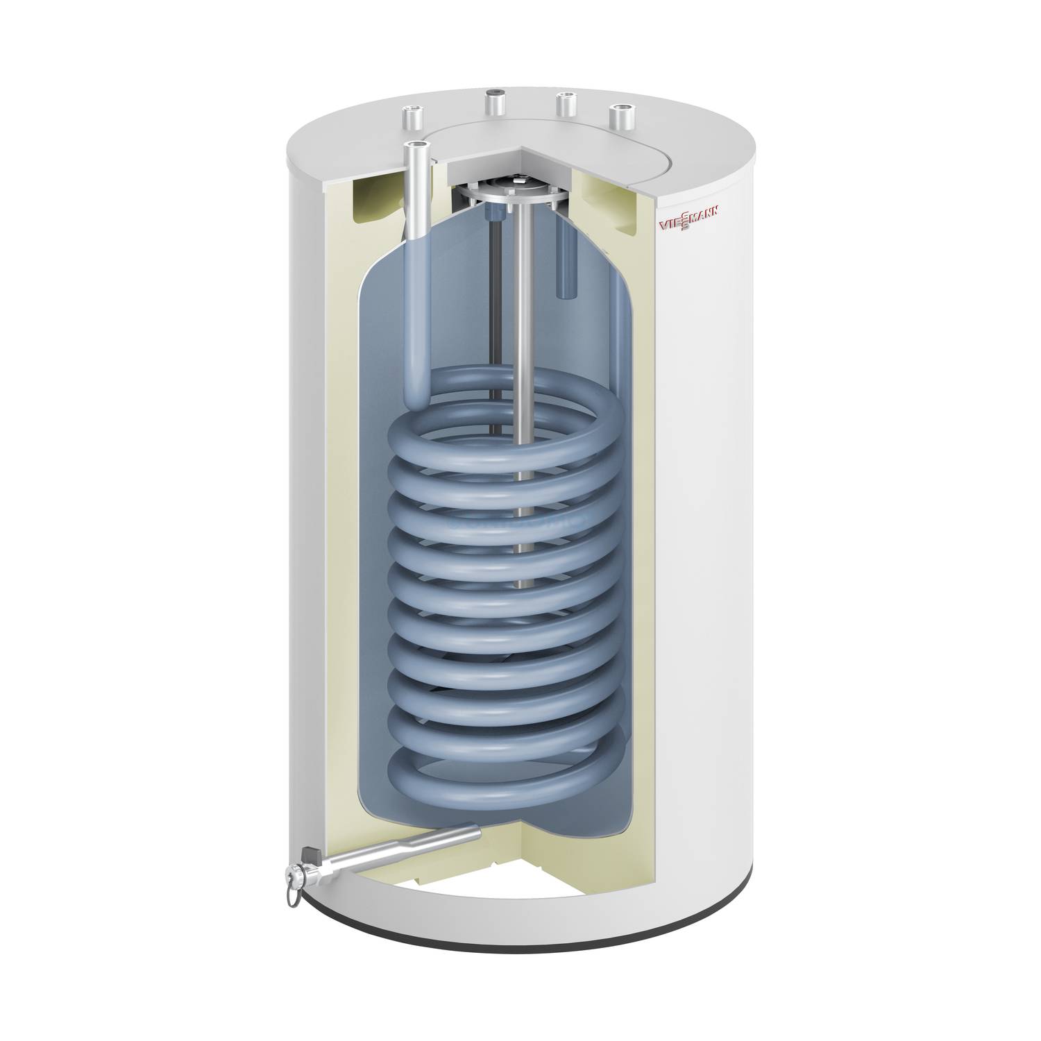Untergestellter Speicher-Wassererwärmer aus Stahl mit innenliegender Heizwendel.