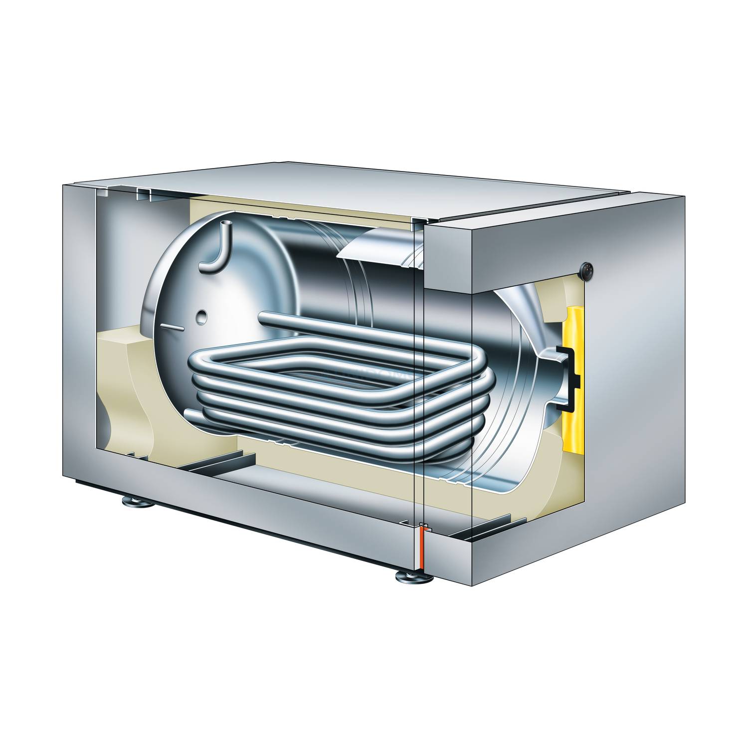 Warmwasserspeicher mit angebauter Wärmedämmung, Stellfüßen, Thermometer und eingeschweißter Tauchhülse für Speichertemperatursensor bzw. Temperaturregler.