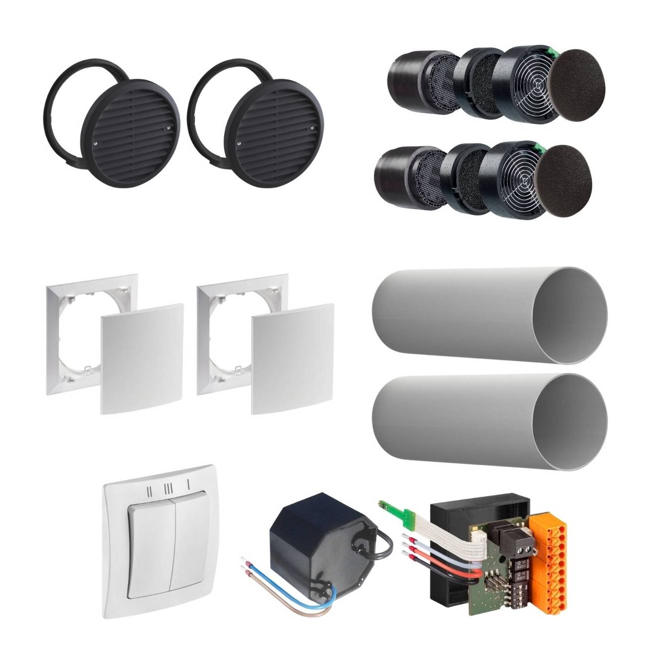 Dieses Set beinhaltet alle Komponenten, welche Sie zur dezentralen Wohnraumbelüftung mit Wärmerückgewinnung eines mittelgroßen Wohnraumes oder 2 kleinerer Wohnäume (mittels Überströmung) benötigen. Über den bedruckten Schalter lassen sich die Lüftungsstufen einstellen.