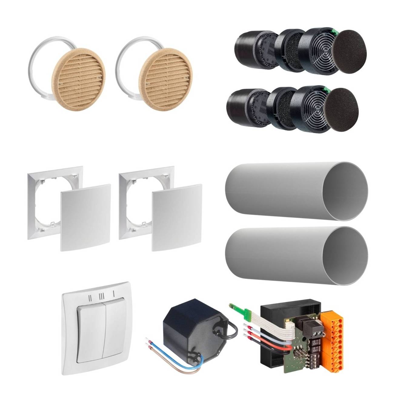 Dieses Set beinhaltet alle Komponenten, welche Sie zur dezentralen Wohnraumbelüftung mit Wärmerückgewinnung eines mittelgroßen Wohnraumes oder 2 kleinerer Wohnäume (mittels Überströmung) benötigen. Über den bedruckten Schalter lassen sich die Lüftungsstufen einstellen.