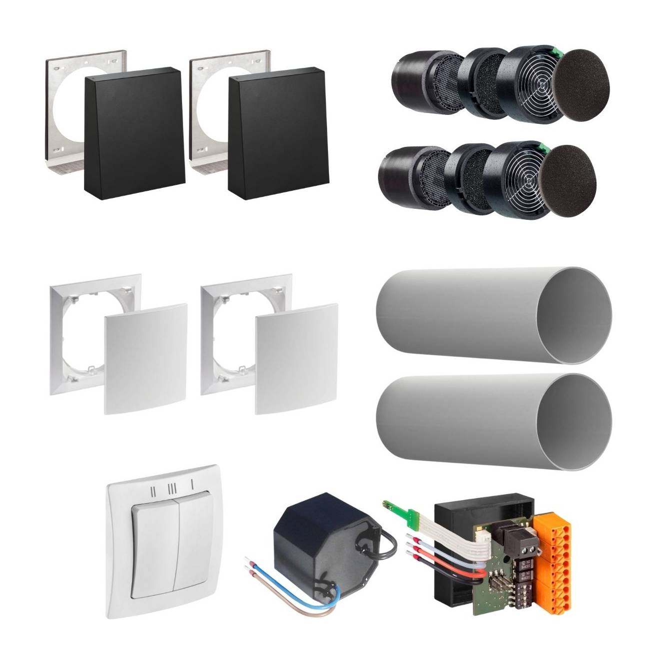 Dieses Set beinhaltet alle Komponenten, welche Sie zur dezentralen Wohnraumbelüftung mit Wärmerückgewinnung eines mittelgroßen Wohnraumes oder 2 kleinerer Wohnäume (mittels Überströmung) benötigen. Über den bedruckten Schalter lassen sich die Lüftungsstufen einstellen.