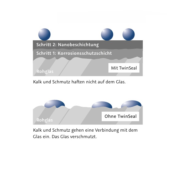 Mit der Glasversiegelung TwinSeal haben wir ein besondere Oberflächenschutzsystem geschaffen, das ein Höchstmaß an Korrosionsbeständigkeit sowie überzeugende hydrophobe Eigenschaften miteinander vereint. Diese Kombination gibt der Glasinnenseite einen doppelten Schutzschild, welcher für eine ultraklare Durchsicht und Transparenz sorgt.